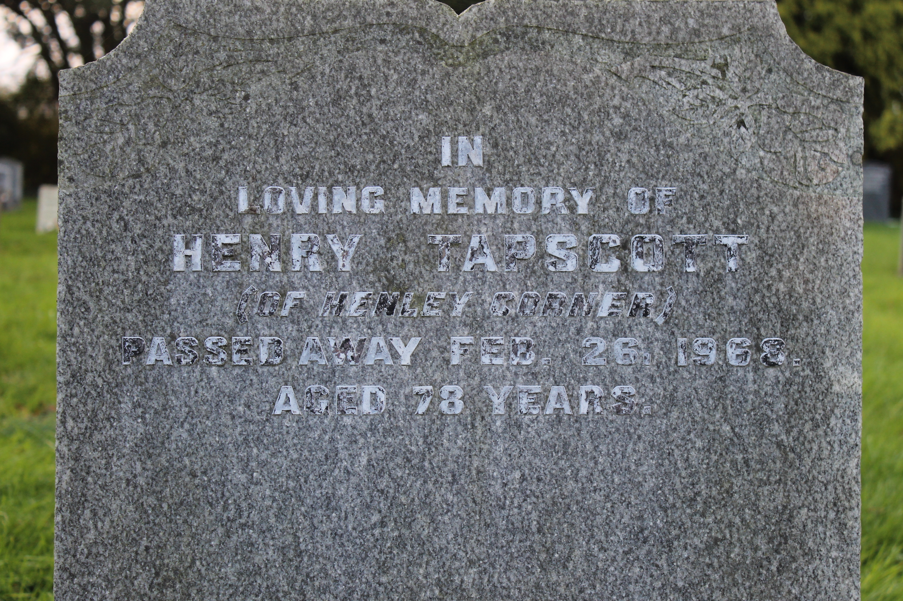 Headstone reads: "In Loving memory of HENRY TAPSCOTT of Henley Corner, who passed away Feb 26 1968, aged 78 years"