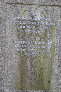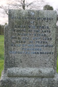 Headstone reads: "In loving memory of Anna Victoria, widow of the late Henry Vigar, died 29 Dec 1929, aged 72 years. Also of her daughter, Florence, died 24 Oct 1966, aged 83"