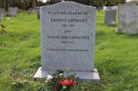 Gravestone reads: "In Loving Memory of Ernest Tapscott 1885-1958 and Annie Ida Tapscott 1885-1975. Both of Howes Farm, High Ham"