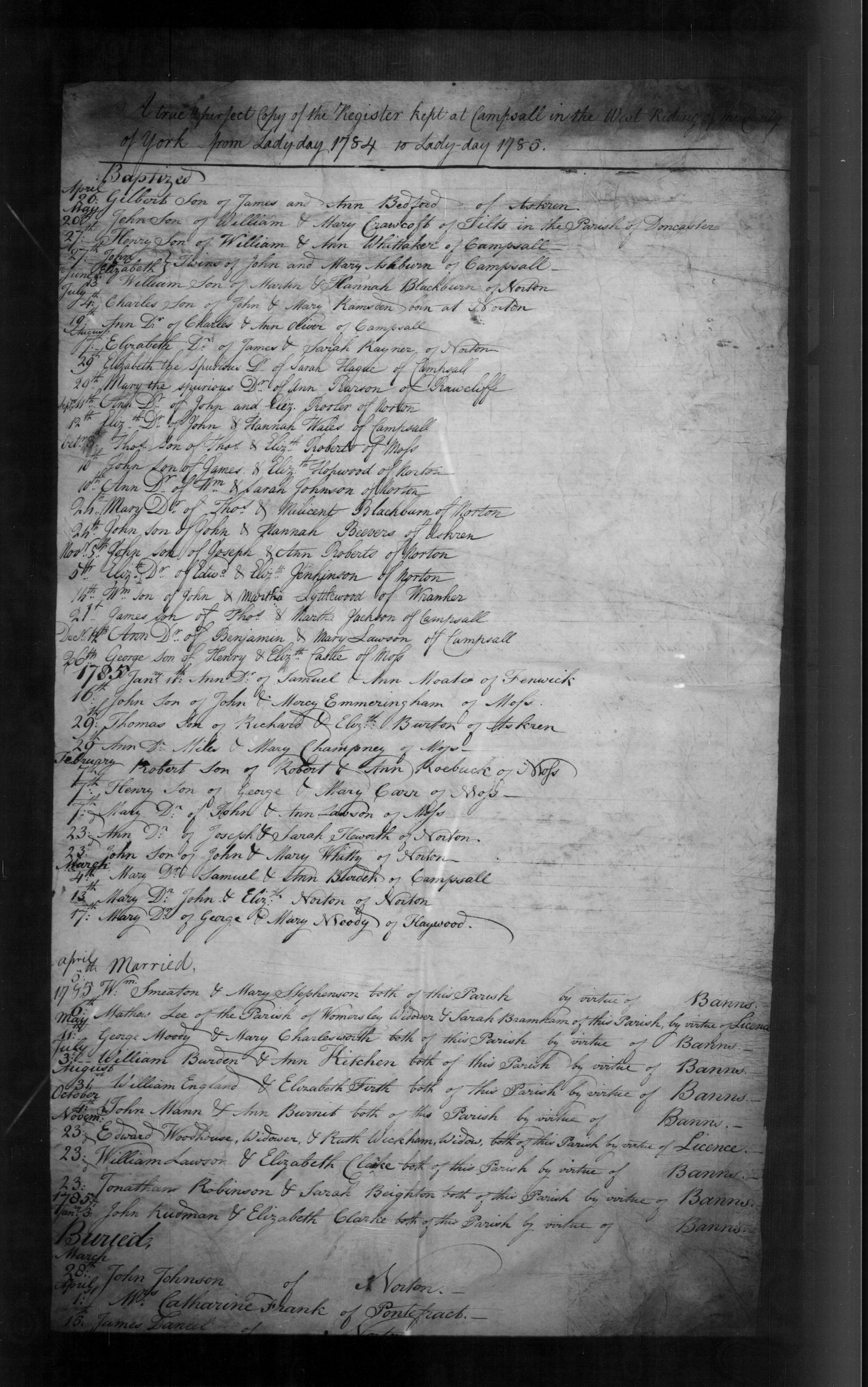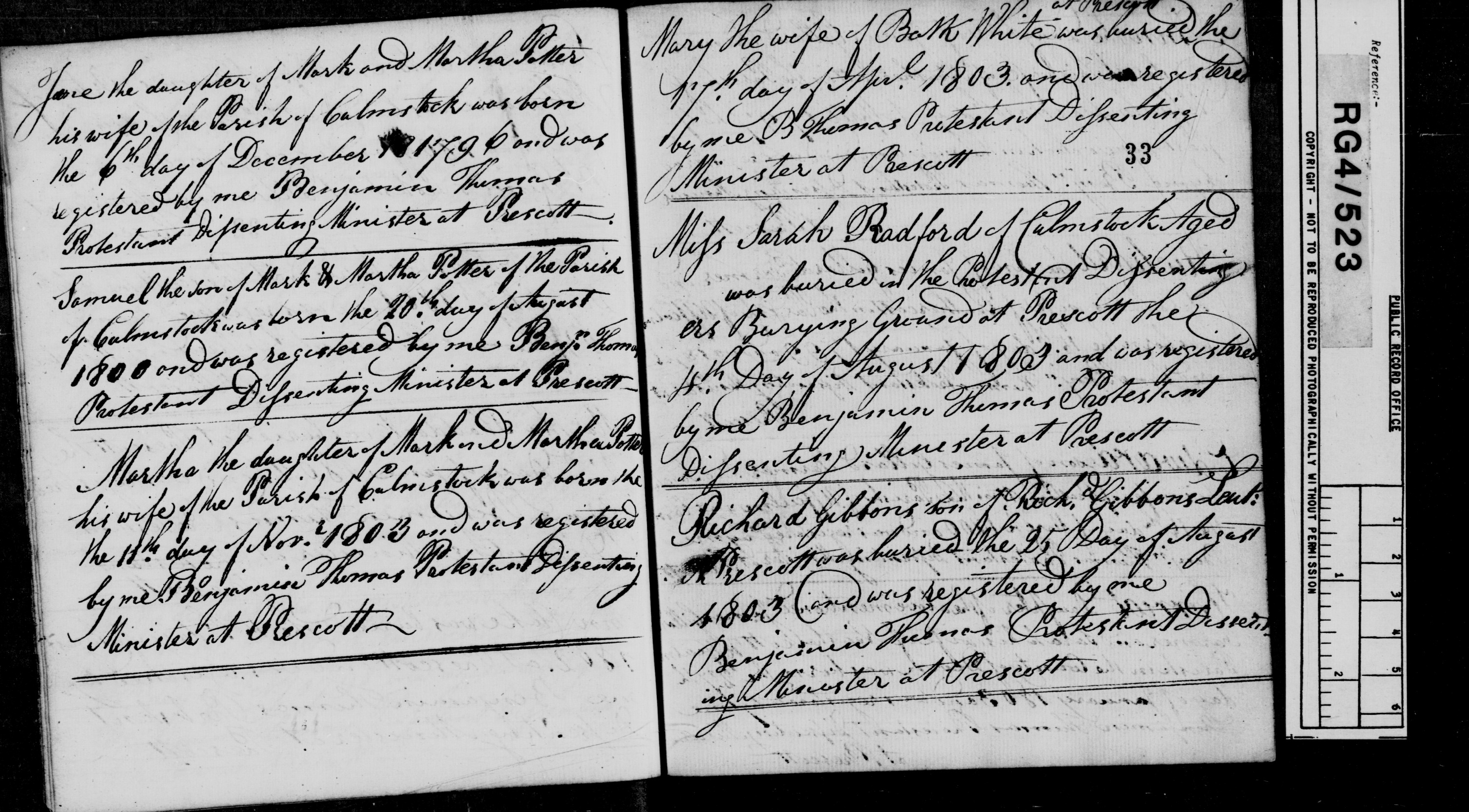 "Mary the wife of Barth White was [unreadable] buried 17th day of April 1803, and registered by me B Thomas (?), Protestant Dissenting Minister at Prescott"