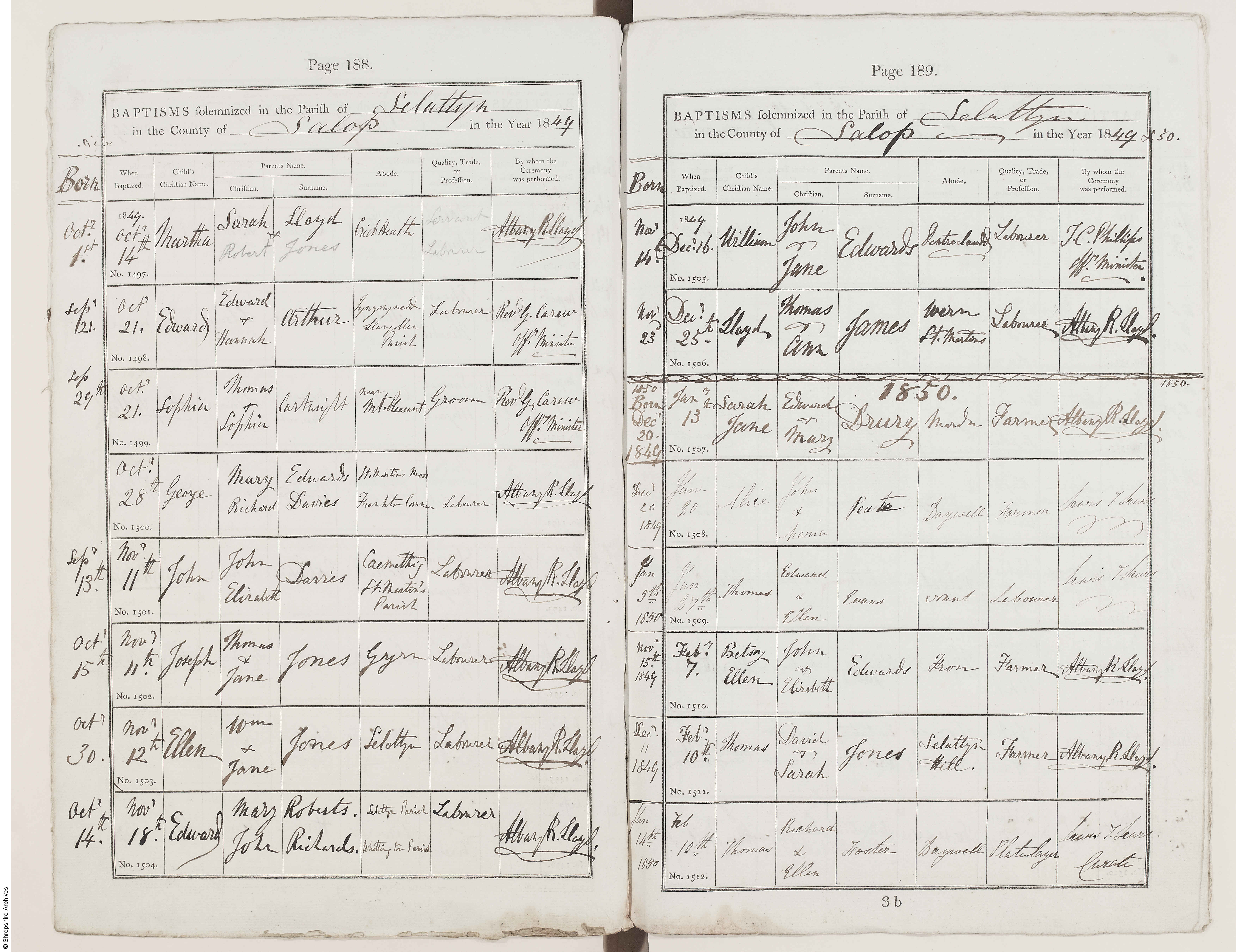 Baptisms solemnized in the Parish of Selattyn in the County of Salop in the Year of 1850.