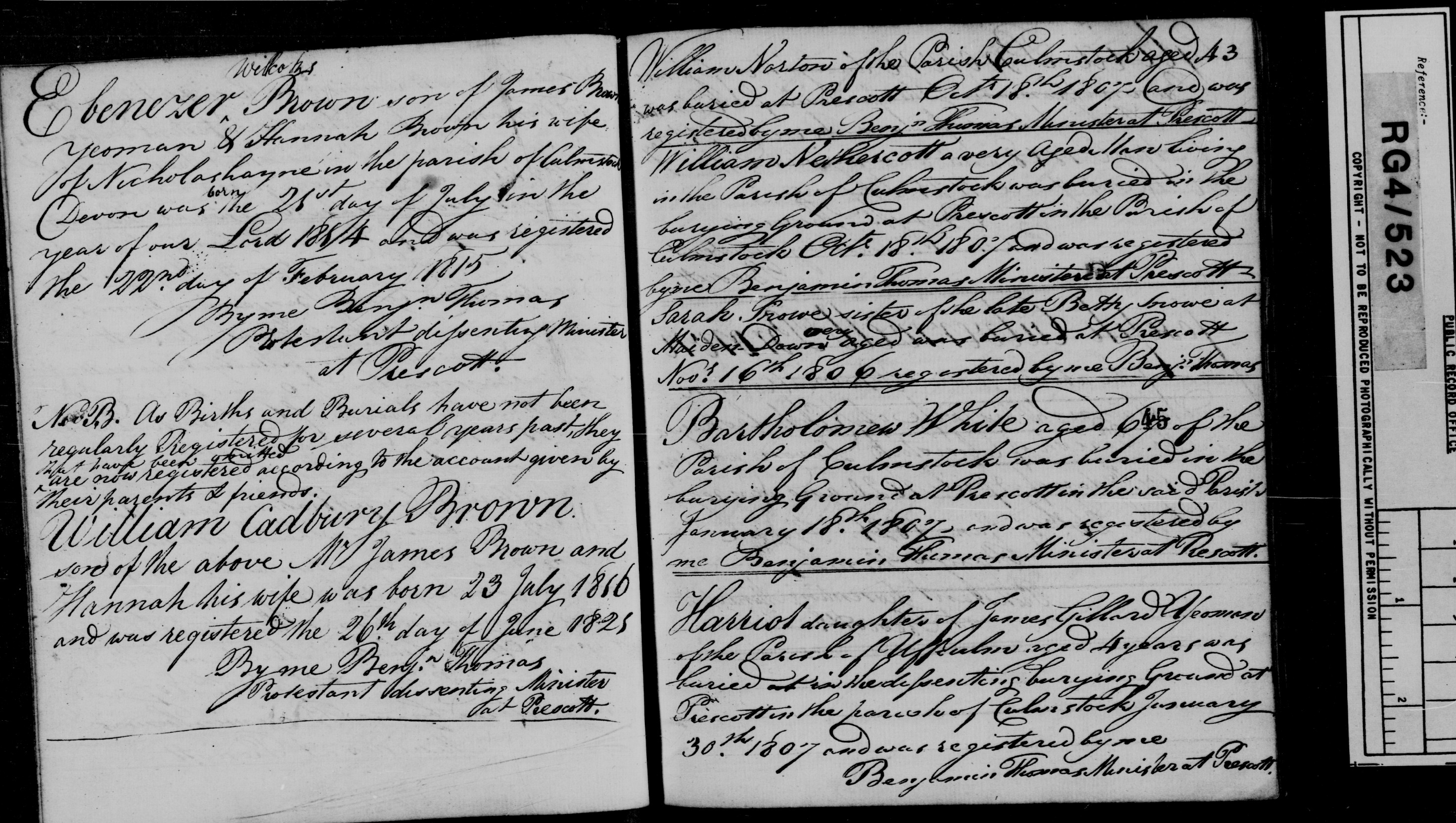 "Bartholomew White aged 67 of the Parish of Culmstock was buried in the Burying Grounds at Prescott in the [unreadable] January 18th 1807, and was registered by me Benjamin Turner (?), Minister at Prescott"
