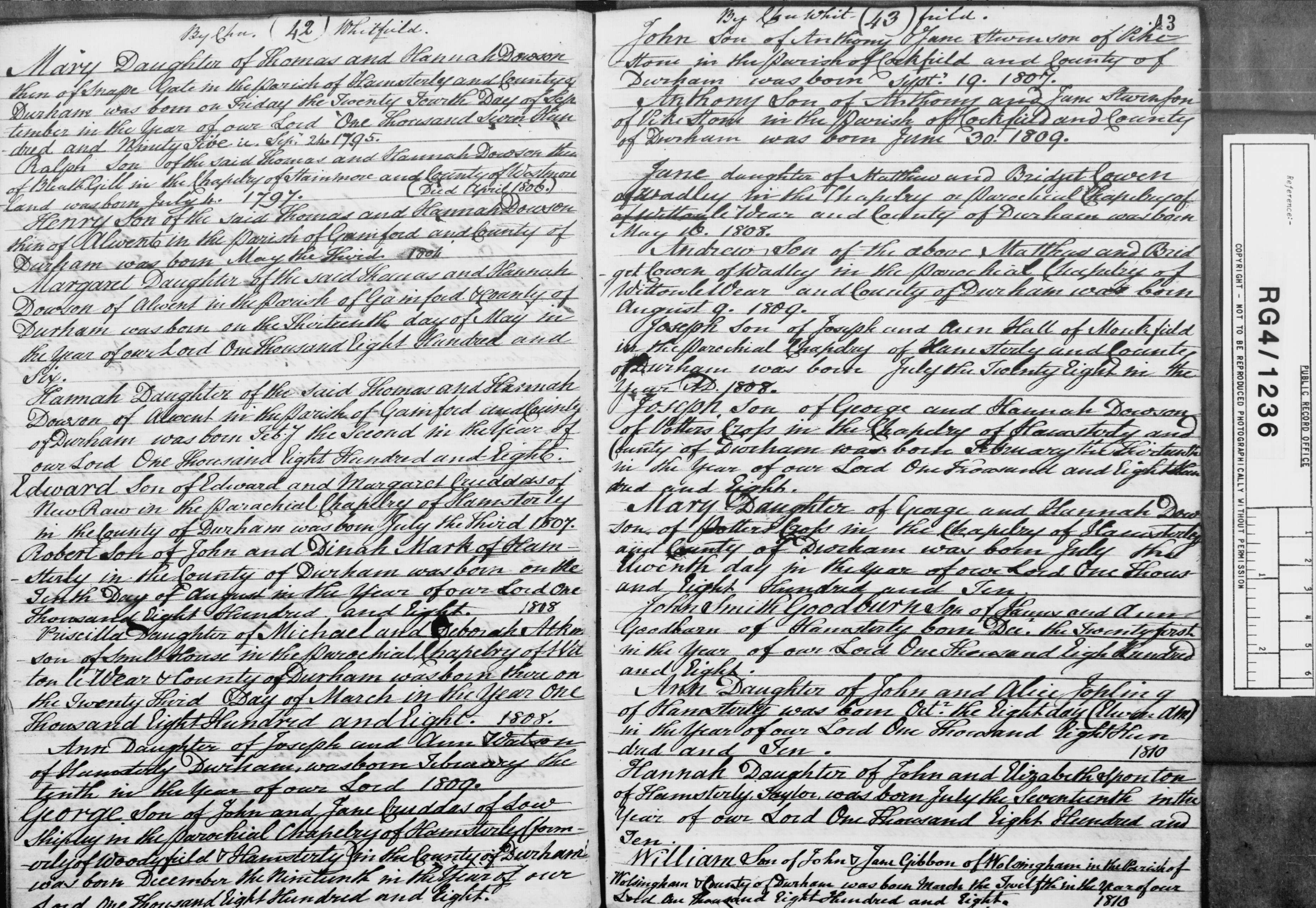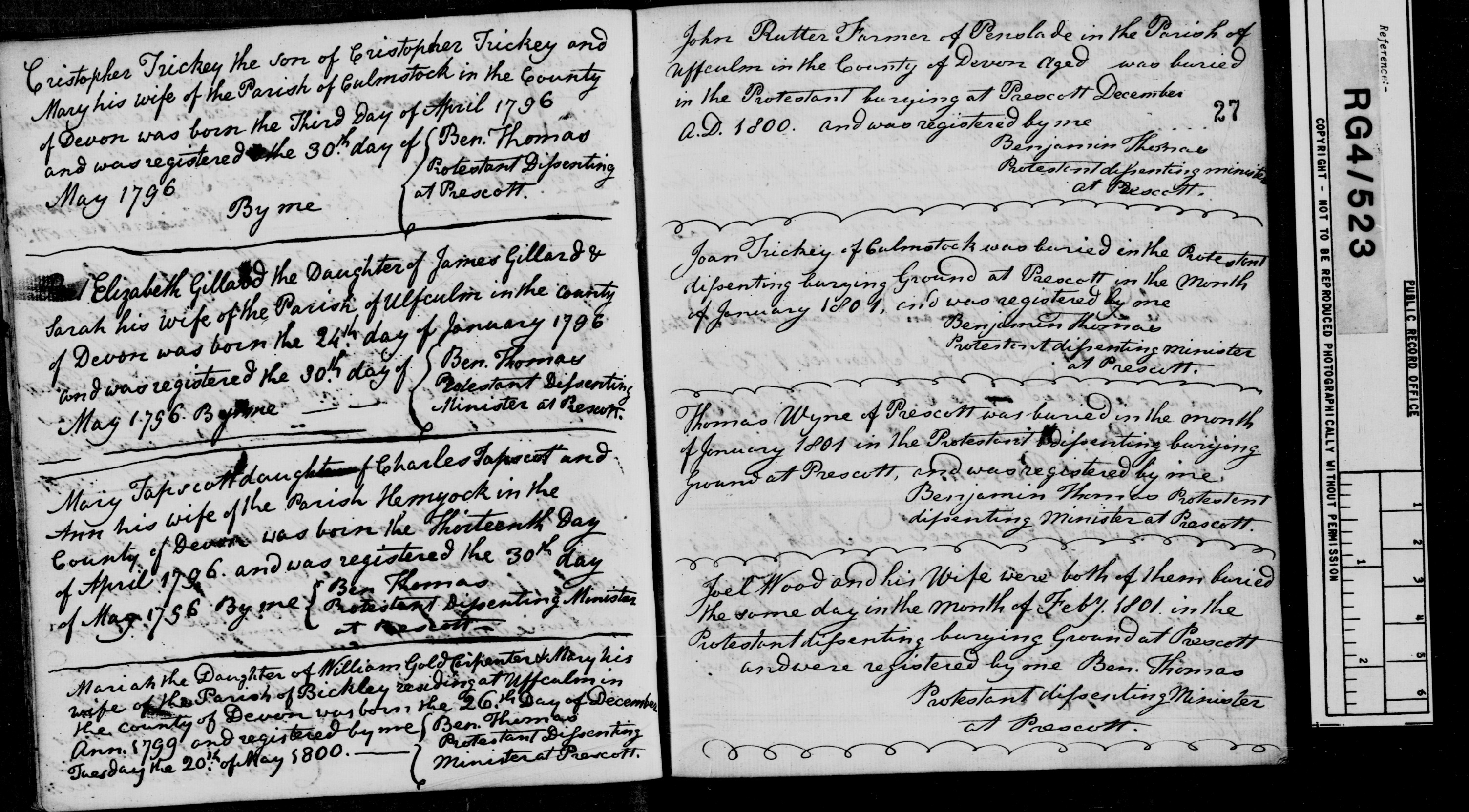 "Mary Tapscott daughter of Charles Tapscott and Ann his wife of the Parish Hemyock in the County of Devon was born the Thirteenth Day of April 1796 and was registered the 30th day of May 1796. By me Ben Thomas, Protestant Dissenting Minister at Prescott"