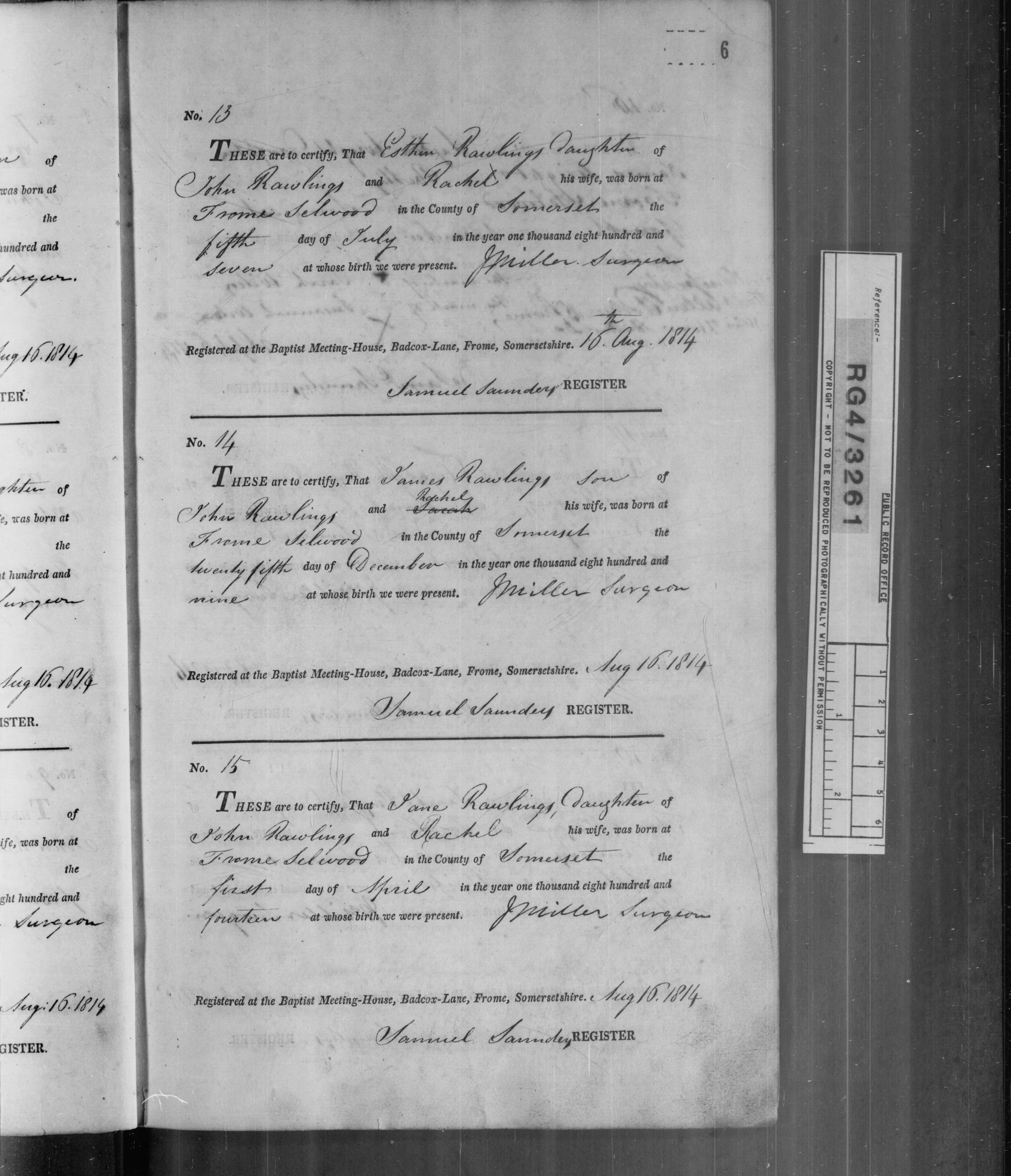 "These are to certify, That James Rawlings Son of John Rawlings and Rachel his wife, was born at Frome Selwood in the County of Somerset this twenty fifth day of December in the year one thousand eight hundred and nine at whose birth we were present. J Miller, Surgeon