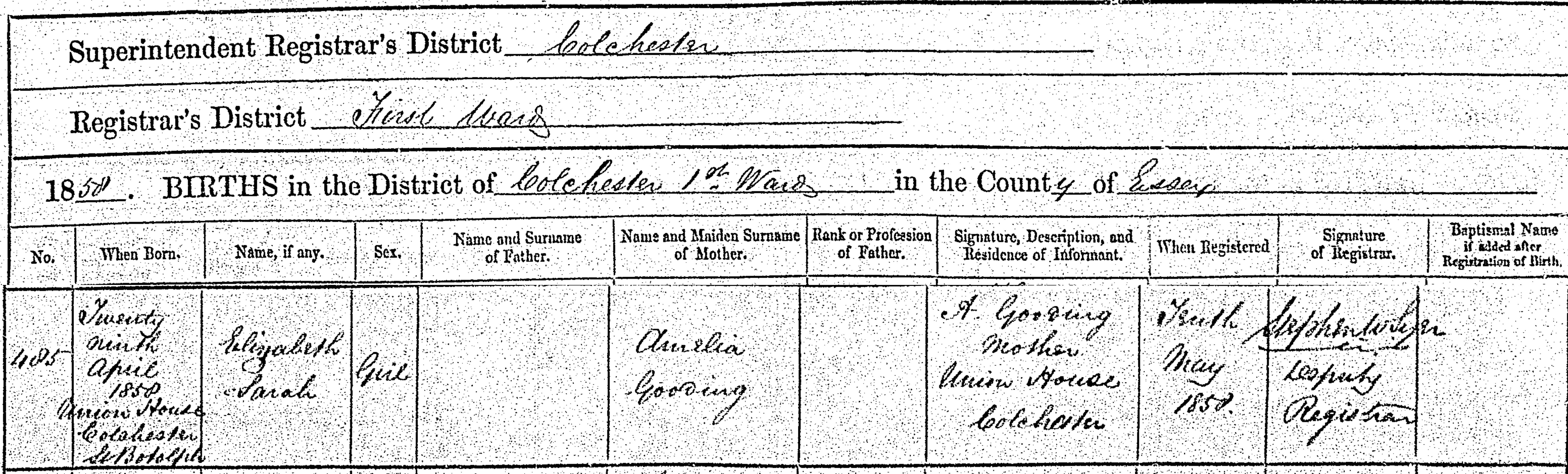Signature, description and residence of informant: A Gooding, Mother, Union House, Colchester