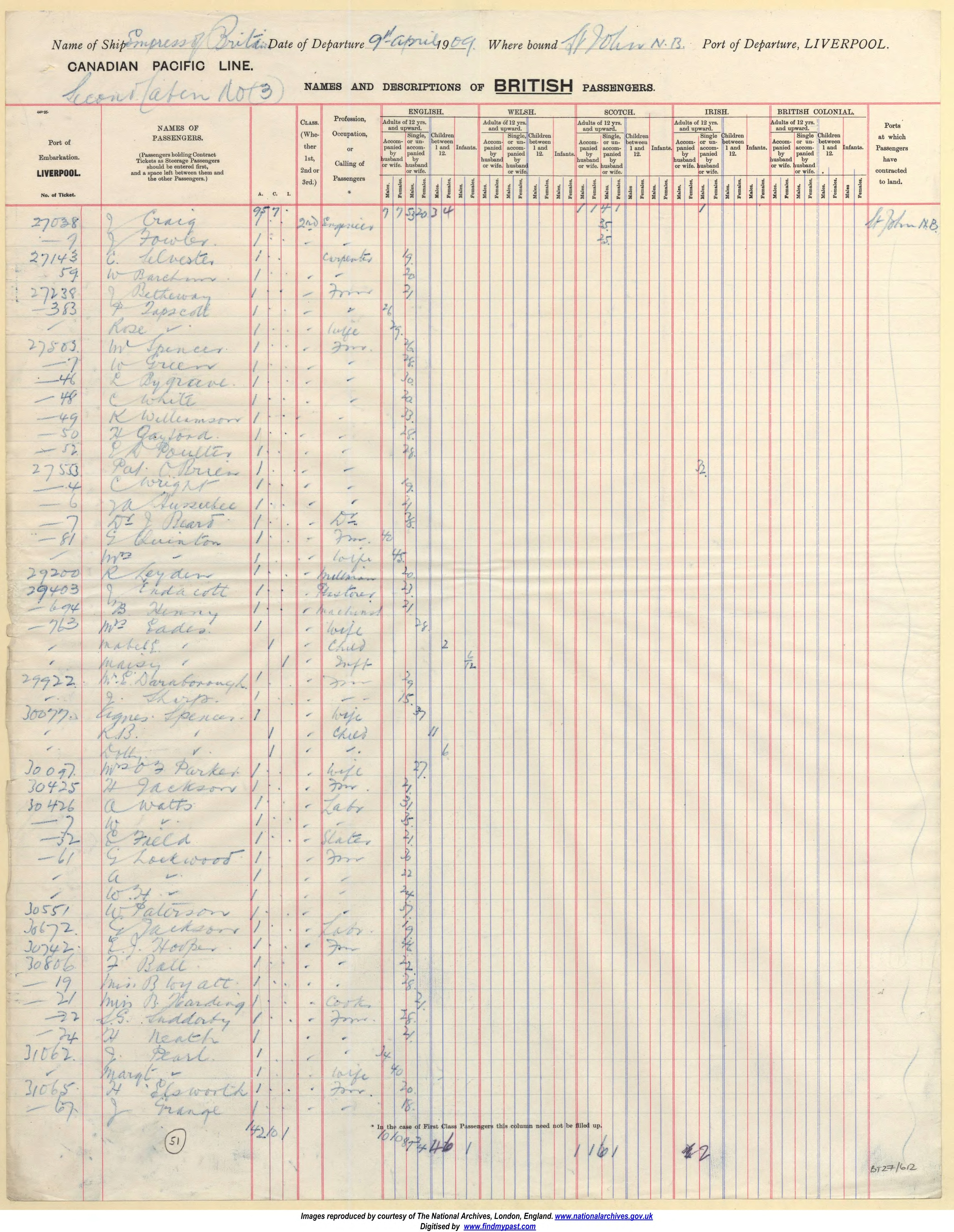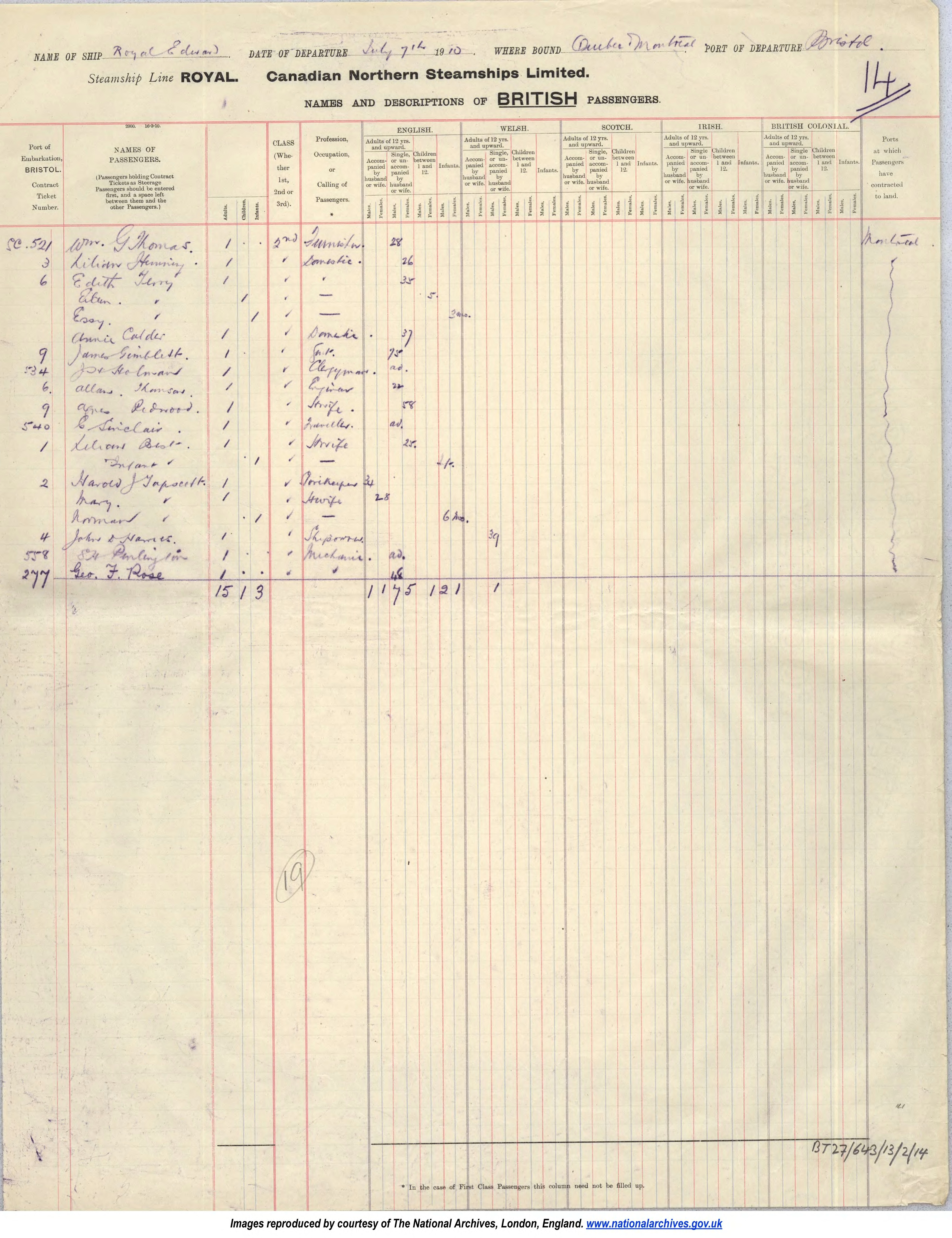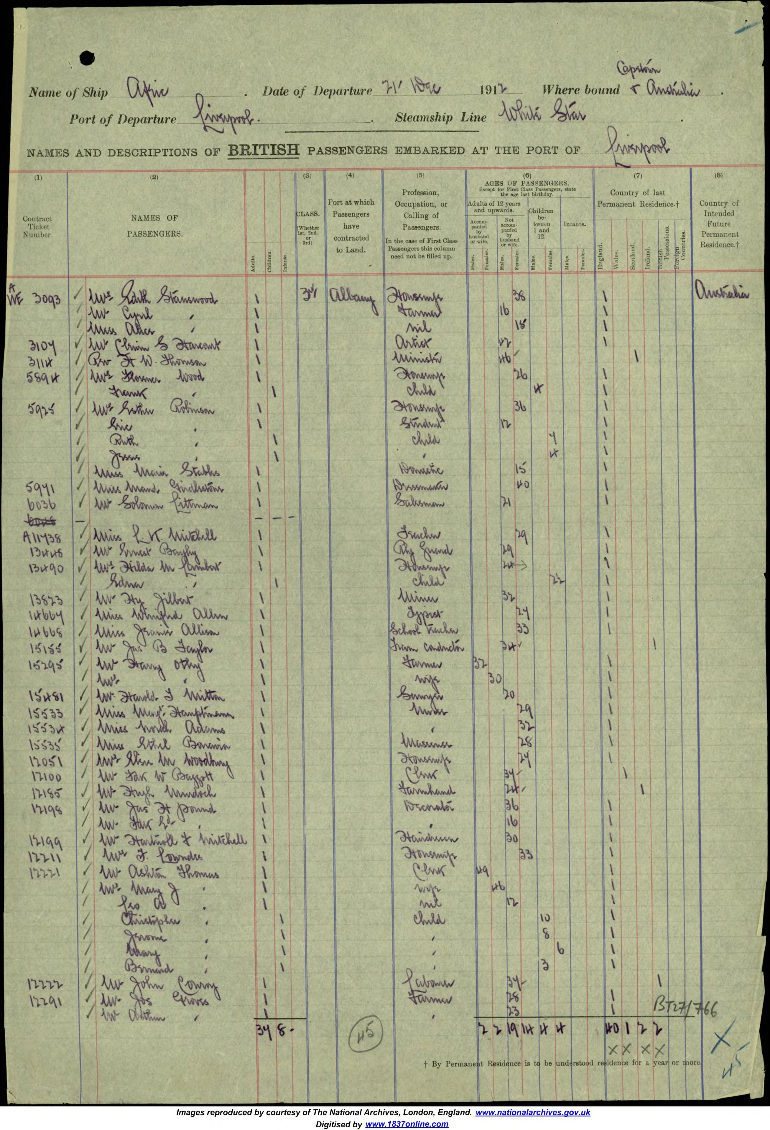 Name of Passenger(s): Wilfred Rawlings Tapscott