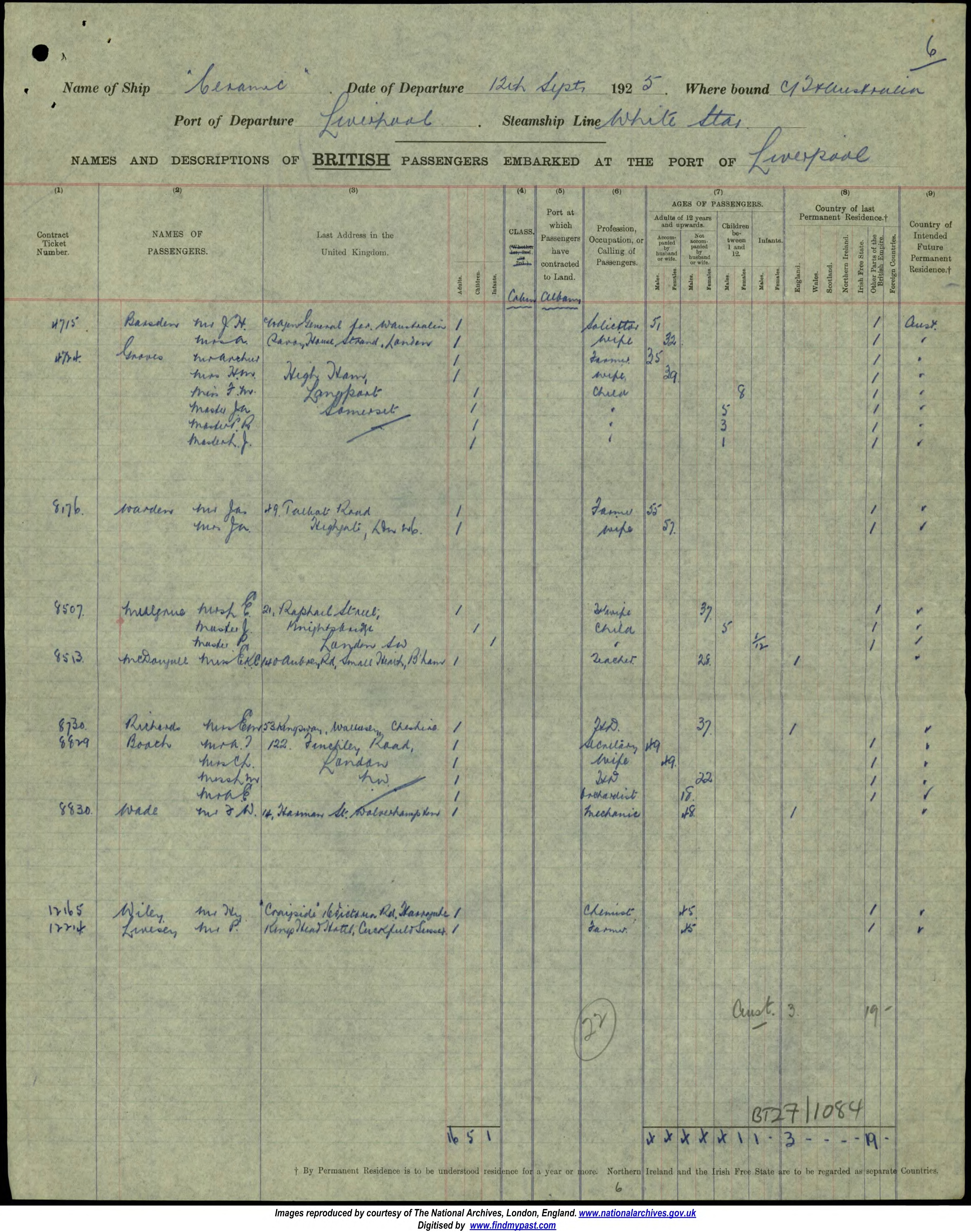 Name of Passenger(s): Arthur Groves, wife Hilda and four children (F, J, P & L)