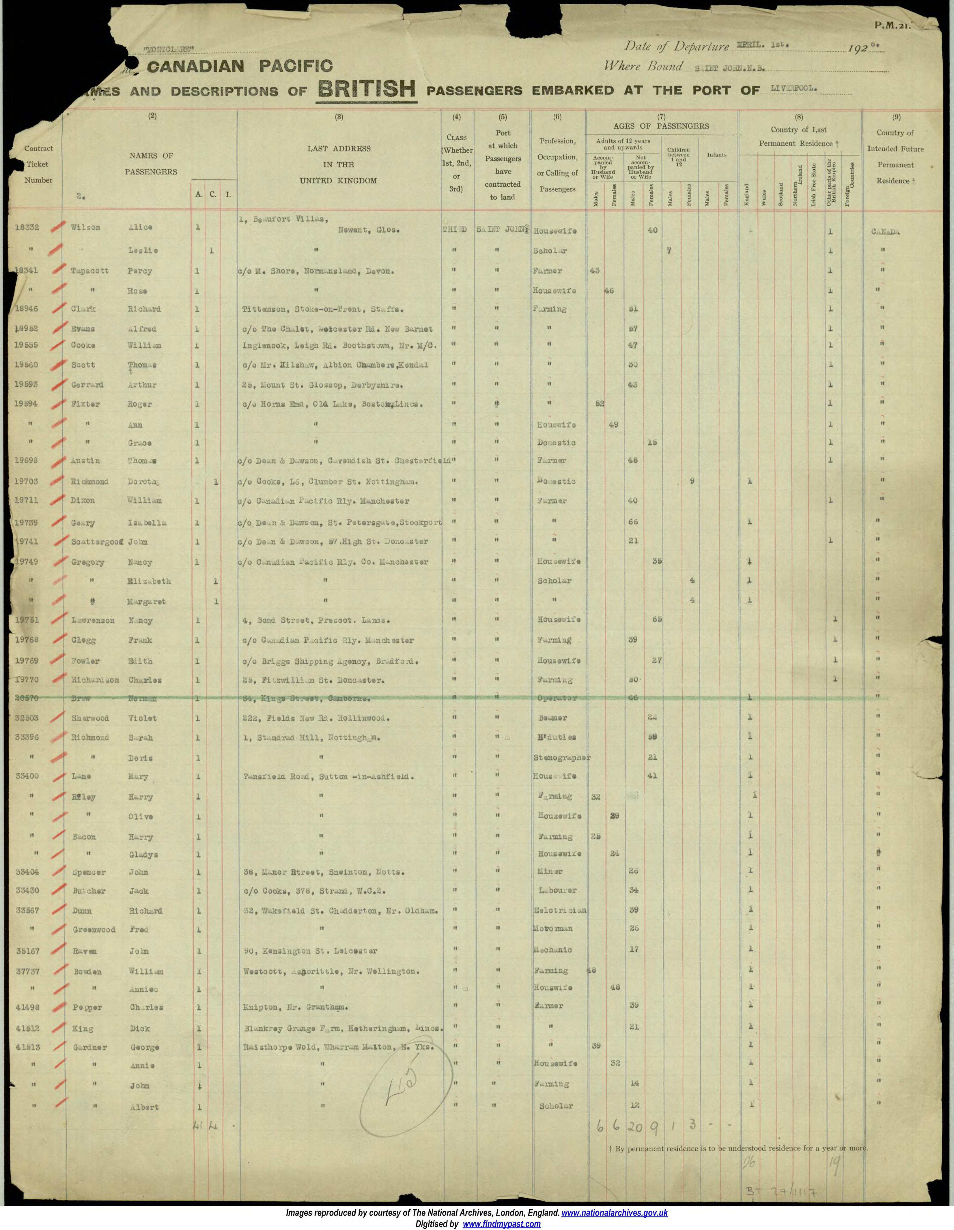 Name of Passenger(s): Percy Tapscott and wife Rose
