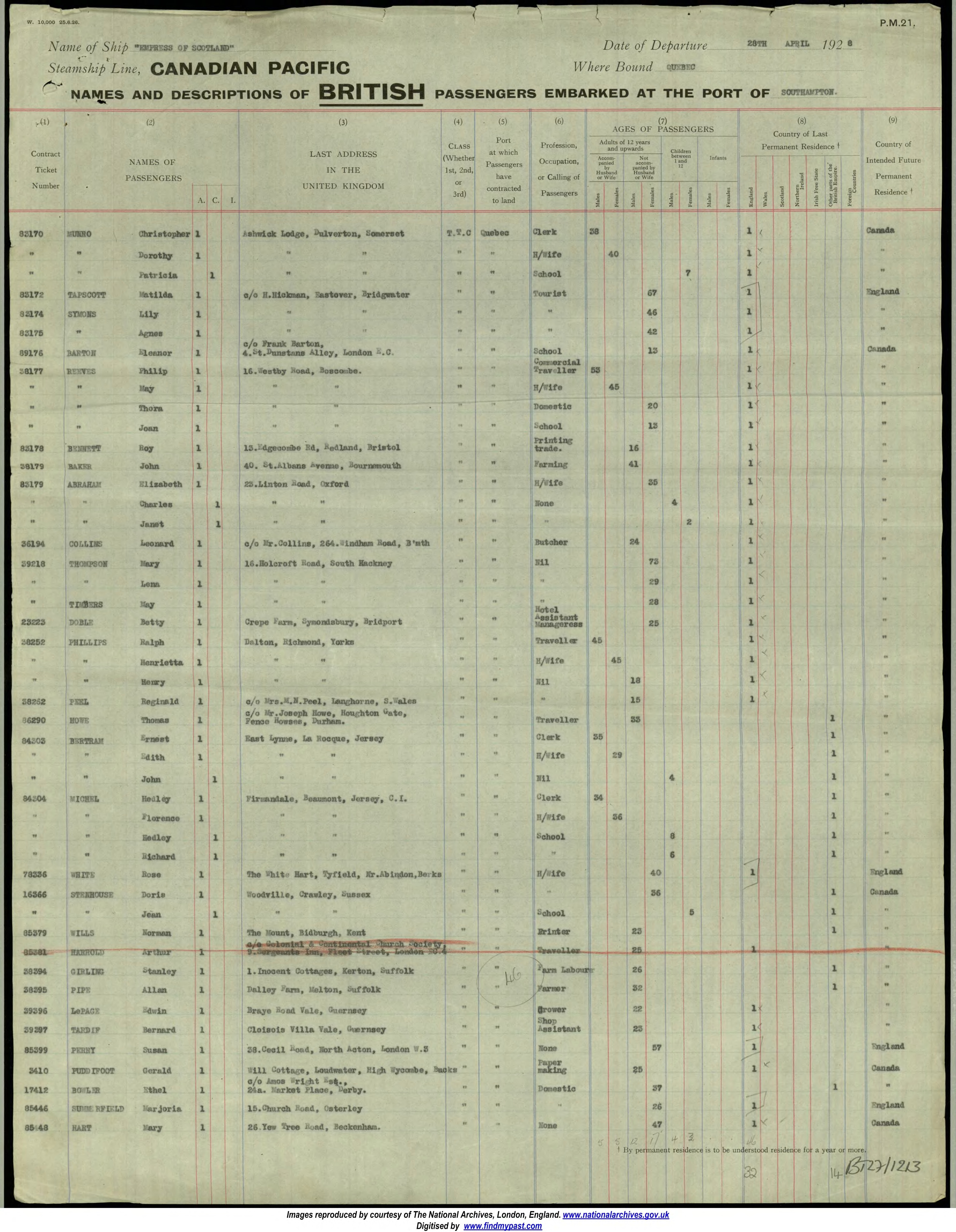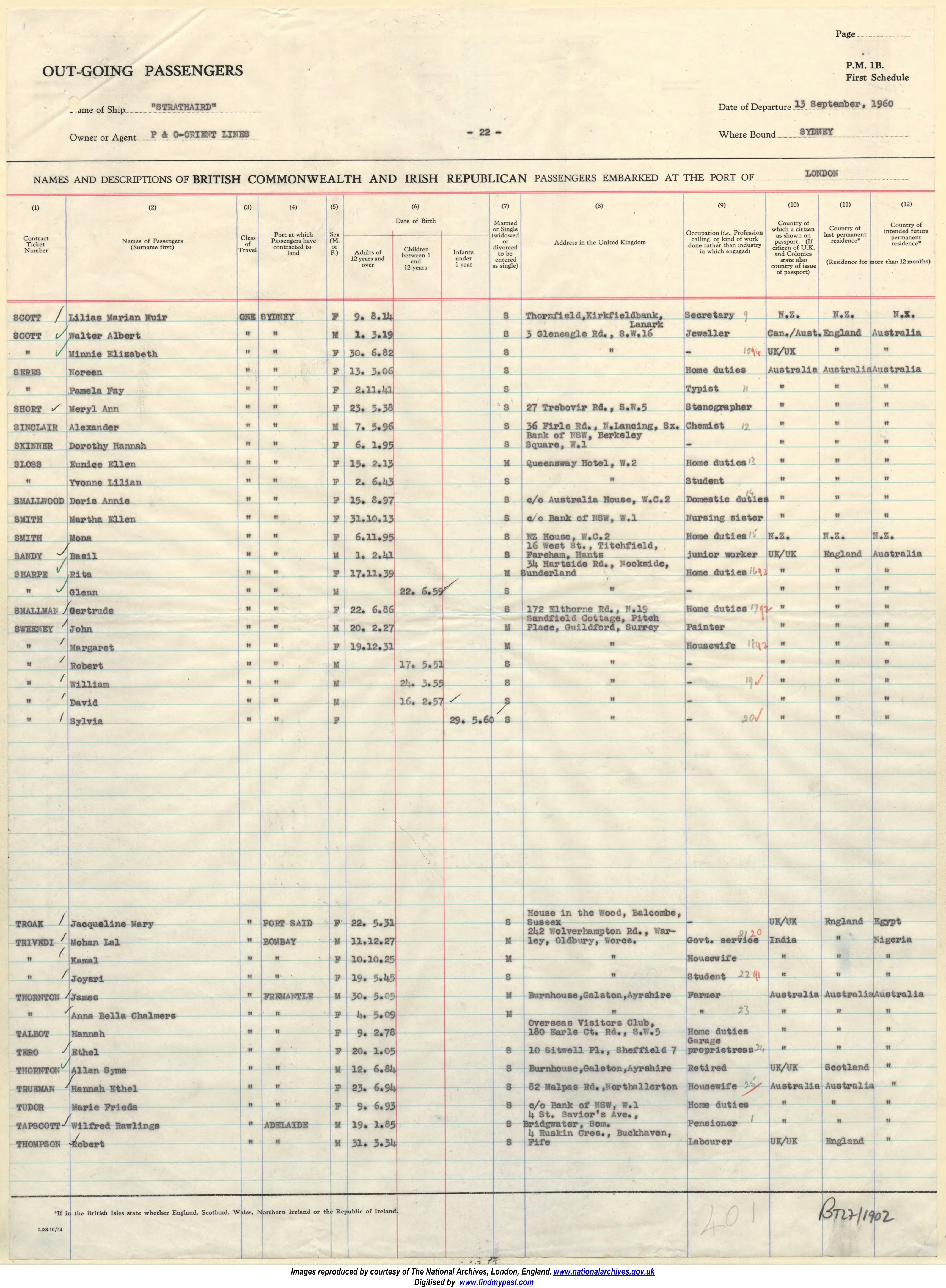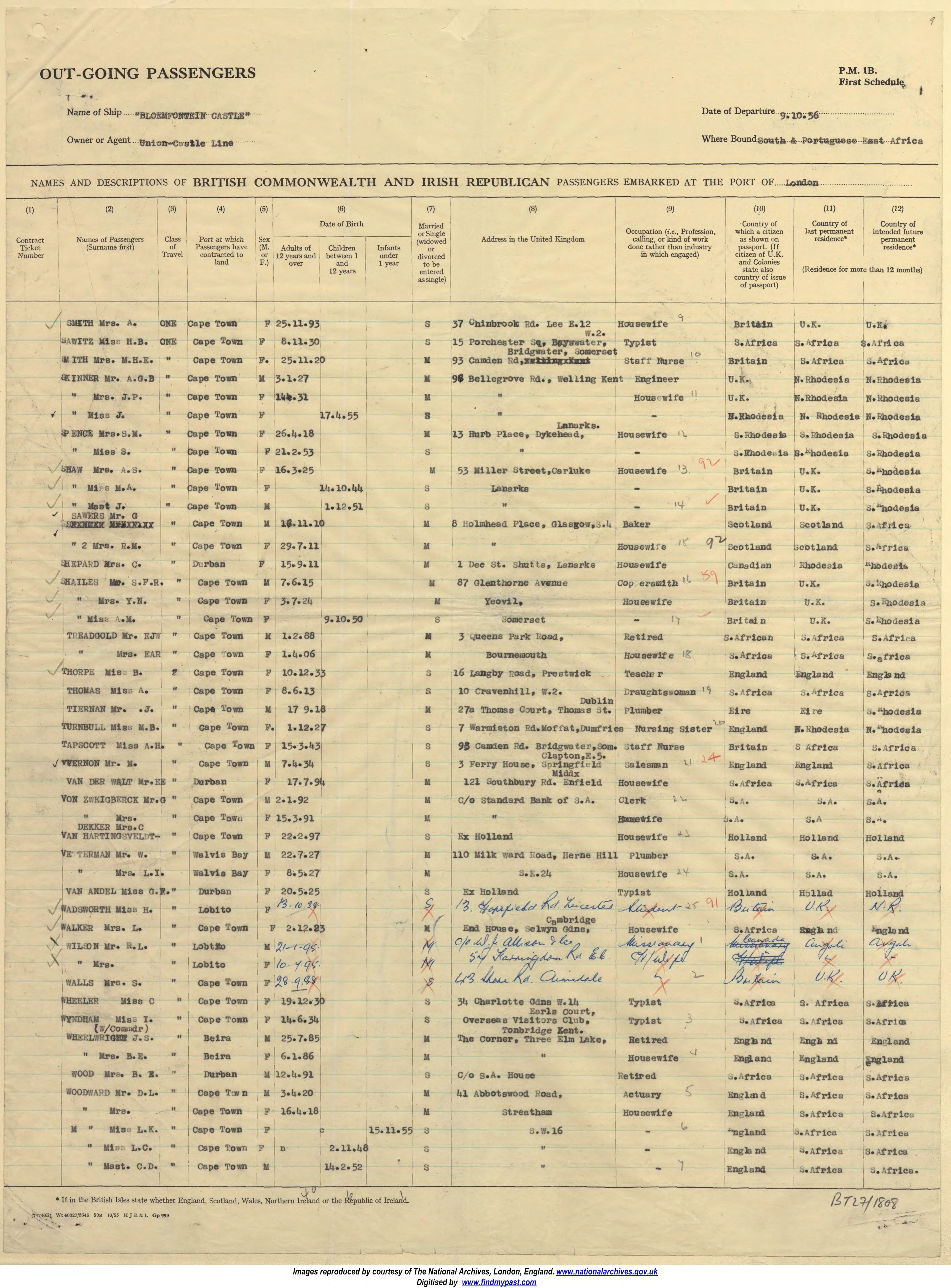 Name of Passenger(s): Mrs M H E Smith and Miss A H Tapscott