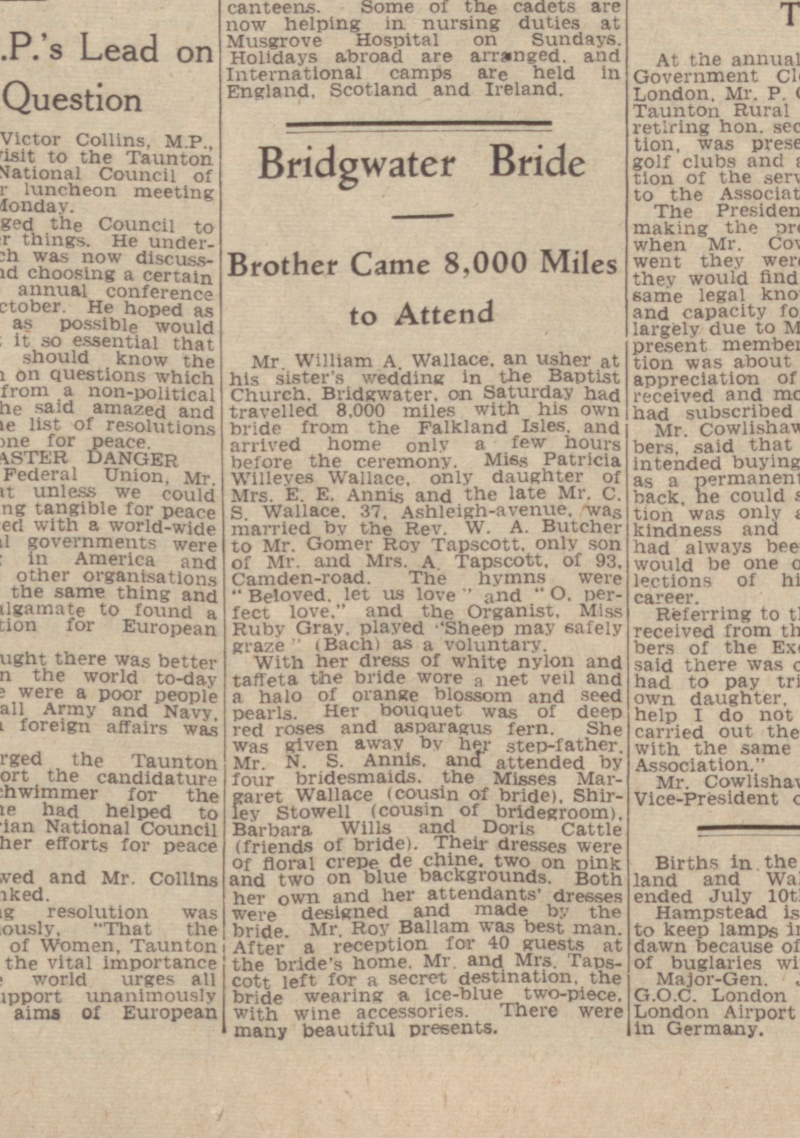 "Private Hubert Tapscott ... of the Canadians, has been home on leave looking very fit. Private Tapscott is the son of Mr Alfred Tapscott, who, after engaging in farming in this country, went to Canada about 11 years ago where he has followed the same occupation. He has left his wife and five children in Canada, and hopes to return to that country when the Hun is beaten. ...."